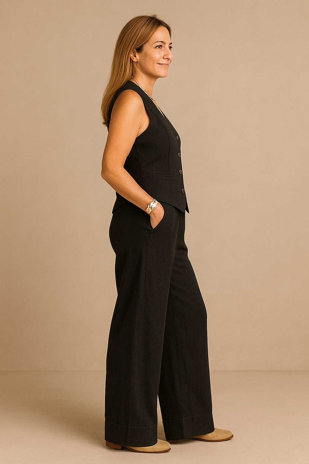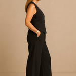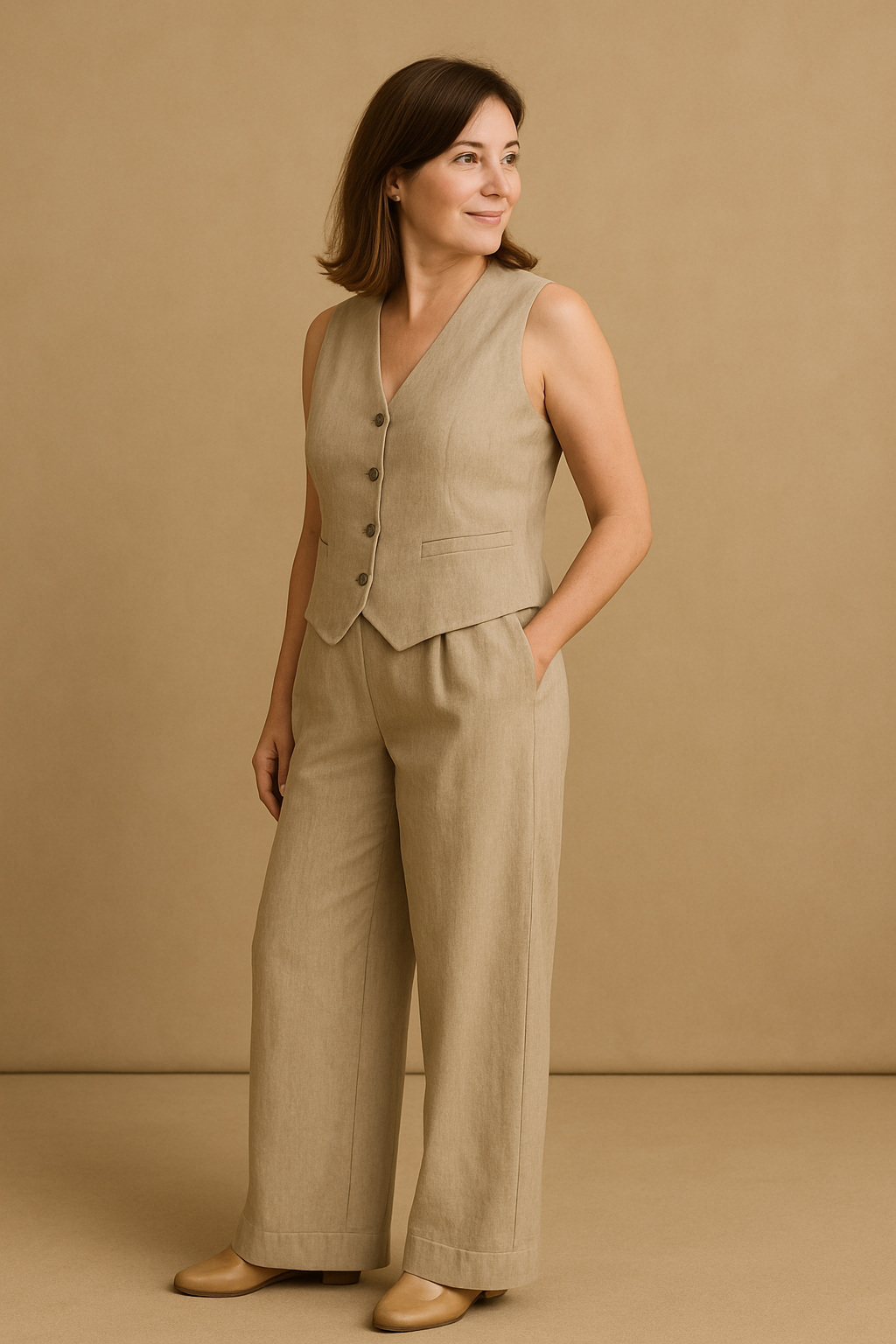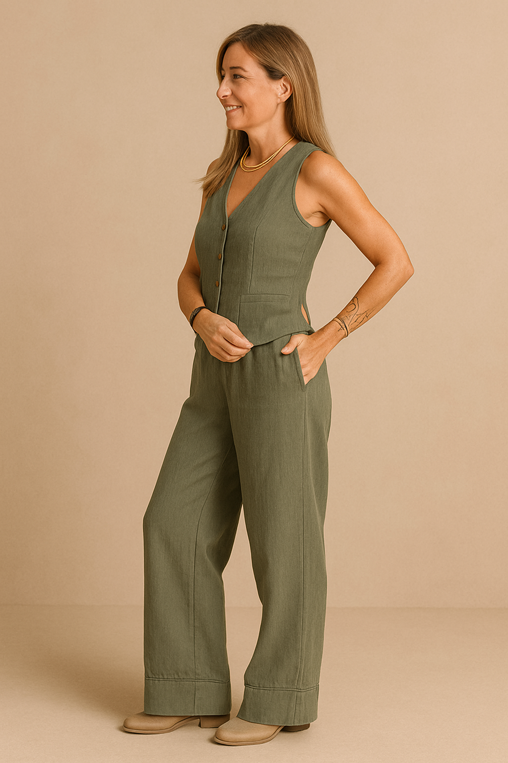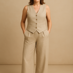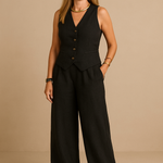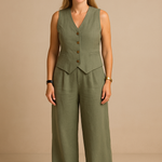 Este conjunto dos piezas está hecho de tejido de algodón y poliéster, materiales suaves y resistentes, que aportan comodidad y un cuidado sencillo. Además, gracias a su cinturilla elástica y su chalequillo con cierre de botones, se adapta a la perfección a cualquier figura y ofrece una libertad de movimientos excepcional. Lo mejor de este conjunto es su versatilidad, ya que puedes vestir ambas prendas juntas o combinarlas por separado.