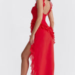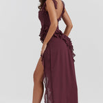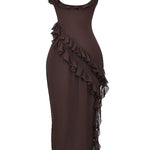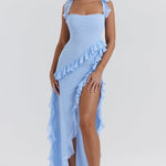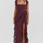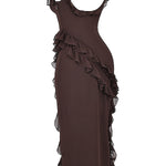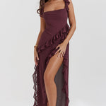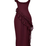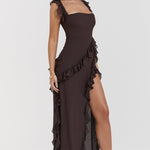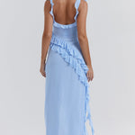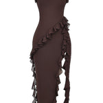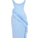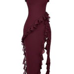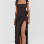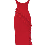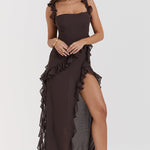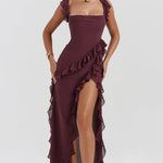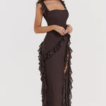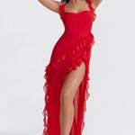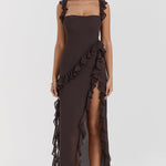 Descubre "Dalia", nuestro vestido largo con volantes. Su diseño ceñido se ajusta a la perfección a tu figura realzando tus curvas, mientras que los volantes añaden movimiento a tu look.