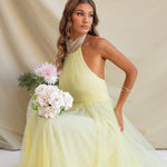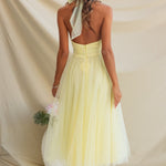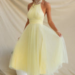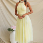 Su tejido de algodón y poliéster es ligero y elegante. Además, su diseño sin mangas con escote halter y espalda descubierta, dan un toque de sofisticación y estilo a tu look. Este vestido es la opción ideal para esas ocasiones especiales en las que quieres sentirte guapa sin perder la elegancia; luciendo perfecta tanto en eventos diurnos como nocturnos.