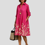 El Vestido Liane es donde la silueta atemporal se encuentra con la belleza botánica. Con su tono fucsia radiante y el elegante motivo floral a lo largo del dobladillo, Liane añade un toque artístico y encantador a tu guardarropa diario. Ya sea que estés asistiendo a una fiesta en el jardín, disfrutando de vino en una terraza, o simplemente disfrutando de un hermoso día, Liane aporta lujo a cada momento—sin sentirte excesivamente vestida. El diseño clásico de vestido camisero mantiene el look anclado y usable, mientras que el detalle floral ofrece un toque refinado. Ligera, fluida y llena de encanto, Liane te permite moverte por la vida con una confianza tranquila y un estilo sin esfuerzo.