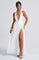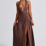 Este vestido destaca por sus sexys y elegantes detalles como su escote halter pronunciado, los tirantes que se unen en lazo en la parte posterior del cuello y su espalda baja en forma de V.