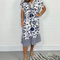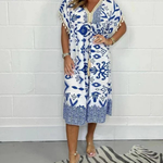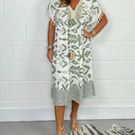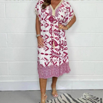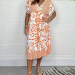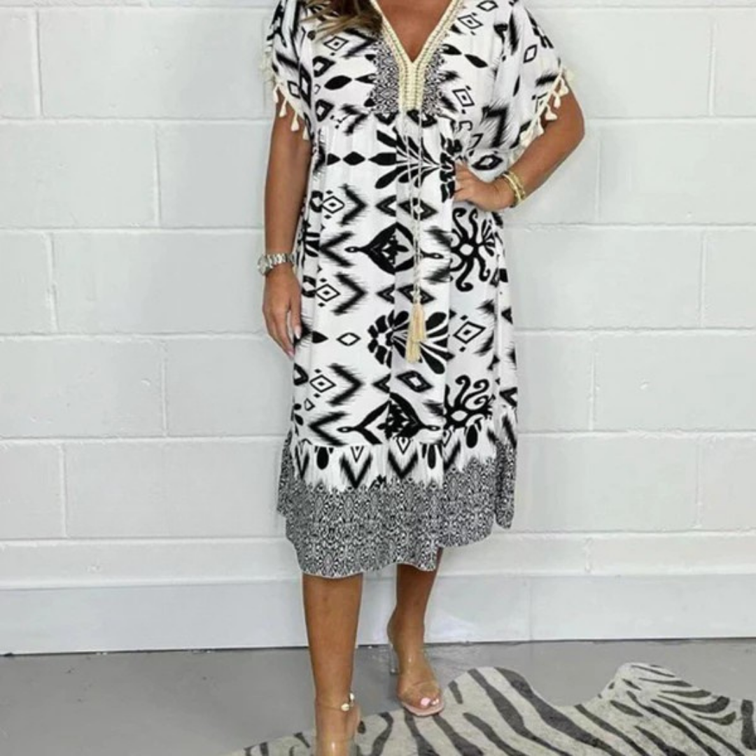 Este vestido estampado cautiva con su llamativo diseño, elegante escote en forma de V y encantadoras mangas adornadas con flecos.