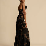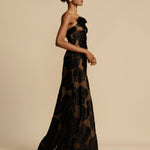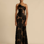 Confeccionado en un estampado floral de terciopelo y forrado en una malla color tostado, este vestido es la definición de sensualidad. El escote presenta un corte asimétrico decorado con una rosa, diseñado para levantar y dar forma al pecho. Su corte ancho y su tirante único brindan un ajuste excepcional a cualquier figura.