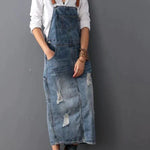 Este vestido de overol de mezclilla rasgado crea un look casual de campo que es fácil de llevar. El material de mezclilla rasgado le da a este vestido un aspecto desgastado y un aspecto multidimensional. Los tirantes cruzados de color marrón claro se mantienen fieles al look clásico del overol de mezclilla. Combina este vestido con unas botas a juego y una blusa fluida para hacer una declaración de moda casual.