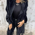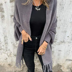 Esta prenda es una opción ideal para salidas con tus amigas o reuniones de trabajo. Gracias a su tejido hecho de lana y algodón y a su corte ancho, aporta libertad de movimientos, comodidad y un cuidado sencillo, por lo que seguirá como nuevo después de cada lavado. Además, combina un elegante cuello chal con mangas largas para brindar estilo y calidez, lo que lo convierte en una prenda imprescindible para los meses más fríos, mientras que los flecos dan ese toque de elegancia.