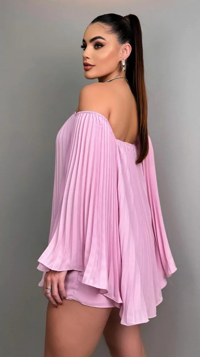 Este conjunto de blusa y short, está confeccionado en gasa plisada, un material suave y resistente que aporta comodidad y un cuidado sencillo. Además, gracias a su corte holgado y diseño plisado, se ajusta a la perfección a cualquier figura y ofrece una libertad de movimientos excepcional. Lo mejor de este conjunto es su versatilidad, ya que puedes vestir ambas prendas juntas o combinarlas por separado.