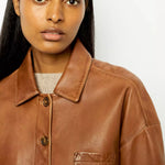 Esta chaqueta corta brinda un ajuste excepcional gracias a su corte recto y sus mangas de 7/8, que también dan una apariencia moderna y relajada. El cuello con solapa añade un toque clásico, que junto a su cierre de 5 botones contribuyen a ese look old-school. Su tejido de cuero es perfecto para el día a día ya que es cálido y cómodo, permitiendo libertad de movimientos.
