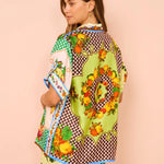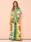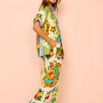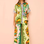 Con su camisa de manga corta con solapa y sus pantalones largos de corte ancho, este conjunto ofrece un equilibrio perfecto entre estilo y comodidad. Hecho en una composición de algodón y poliéster, es la opción perfecta para esos días en los que quieres ir elegante y cómoda. Enamórate de su diseño, en el que sus vibrantes colores se combinan a la perfección con un estampado único.