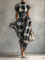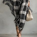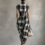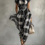 Un vestido maxi de chiffon a cuadros ligero, caracterizado por un elegante cuello alto, una caída elegante y una cintura con cinturón para una definición favorecedora.