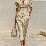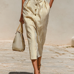 Un vestido midi a rayas atemporal con detalles de sastrería y un diseño de cintura que realza la figura, ideal para una sofisticación diaria.
